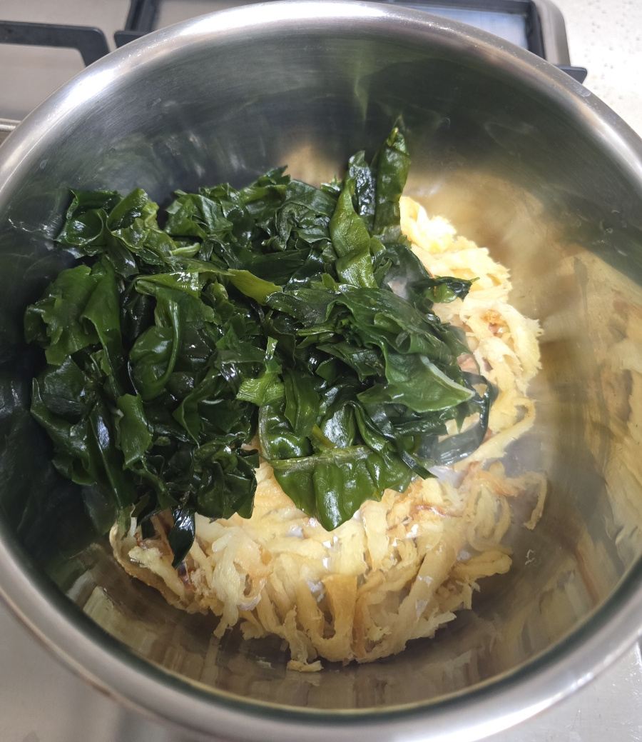 황태에서 고소한 향이 올라오면, 준비된 미역을 넣고 함께 볶아요.