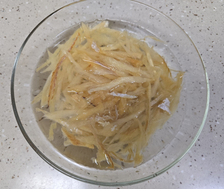 황태는 흐르는 물에 가볍게 헹군 다음, 찬물에 1분 정도만 담가 부드럽게 불려요.