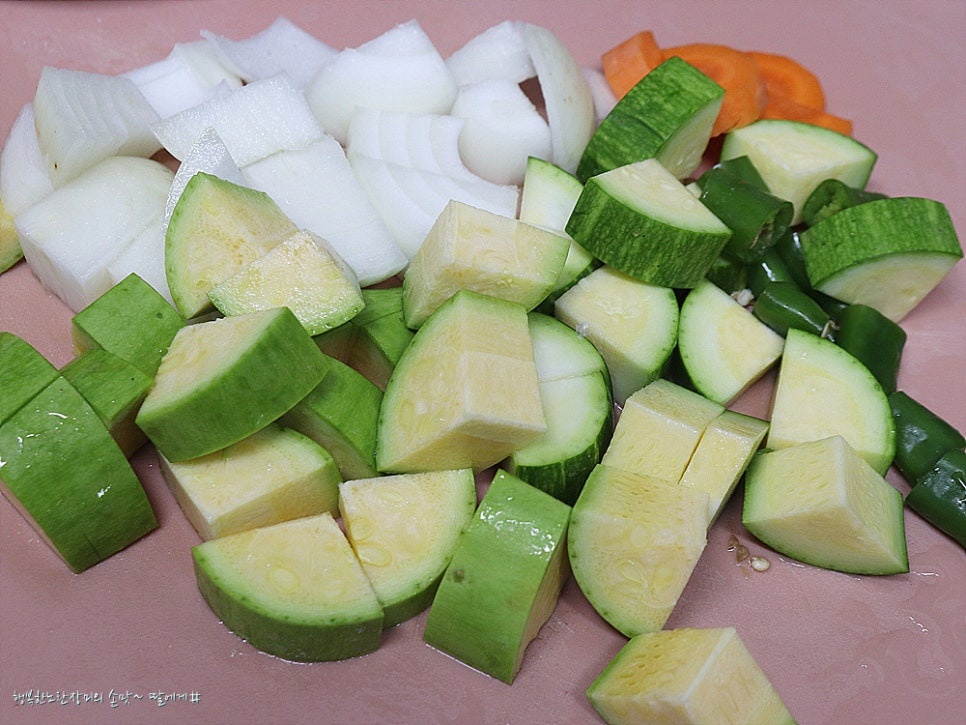 호박 1/2개, 양파 반개, 대파 1/2대, 당근 조금
