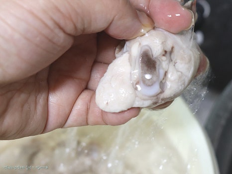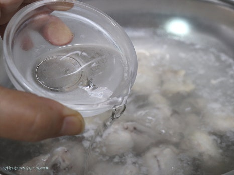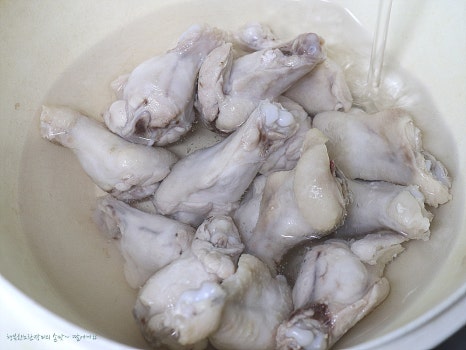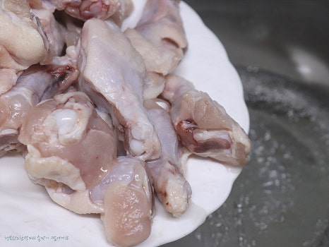 찬물에 하나하나 뼈에 붙은 핏기를 씻어줘요~