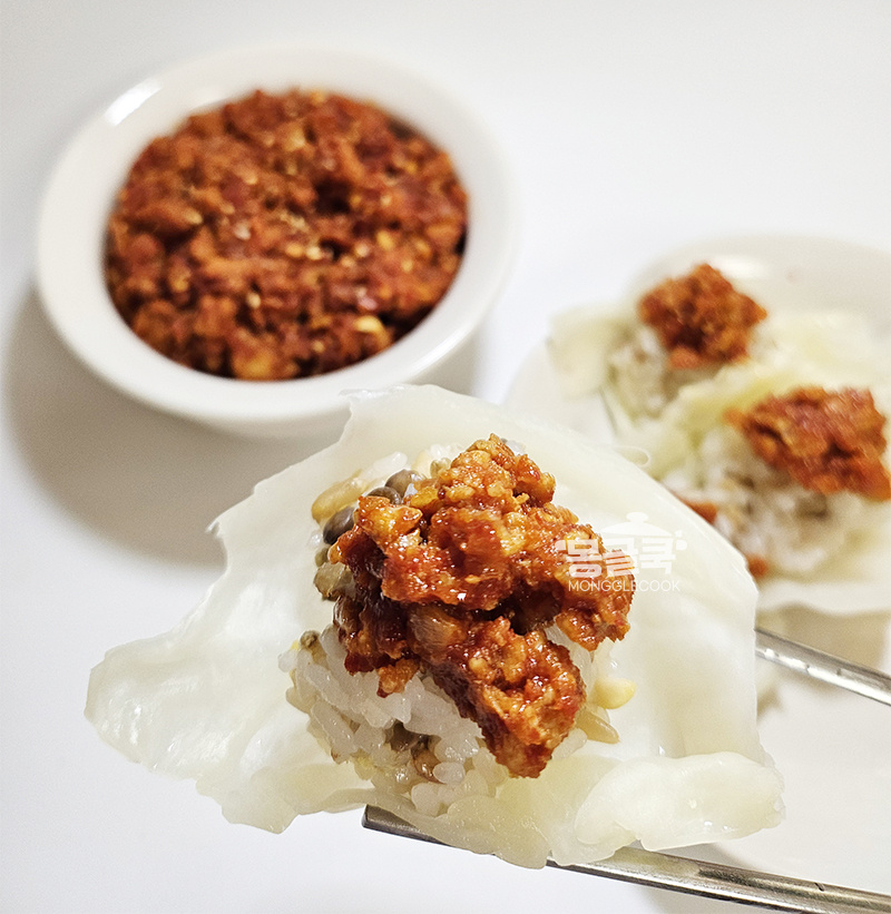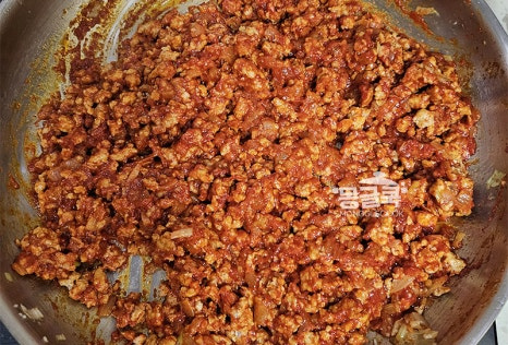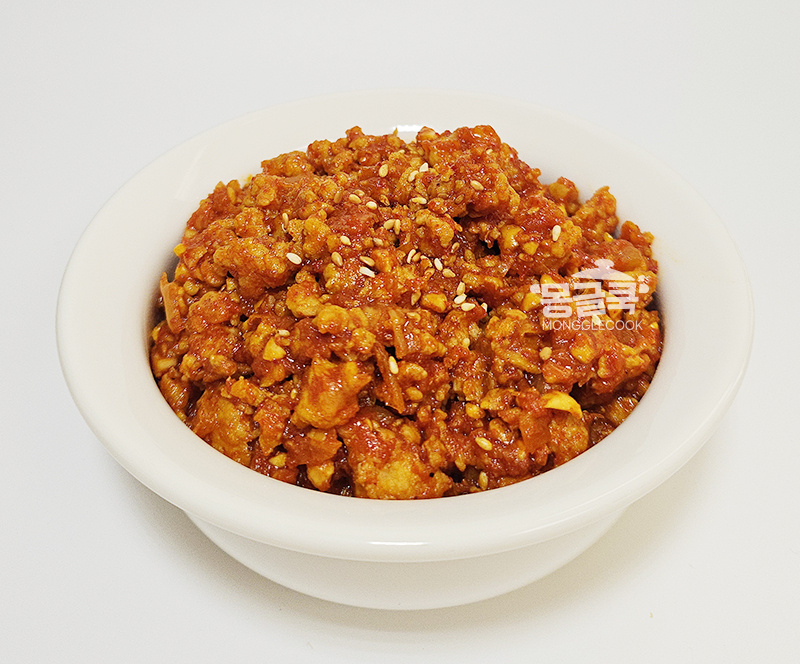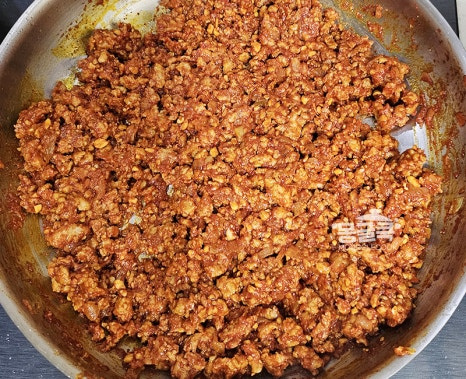 너무 되직하면 물 또는 육수 50~100ml를 넣고 3~5분 정도 천천히 졸여주세요. 걸쭉하면서도 밥에 비벼 먹기 좋은 농도가 될 때까지 조절하면 돼요.