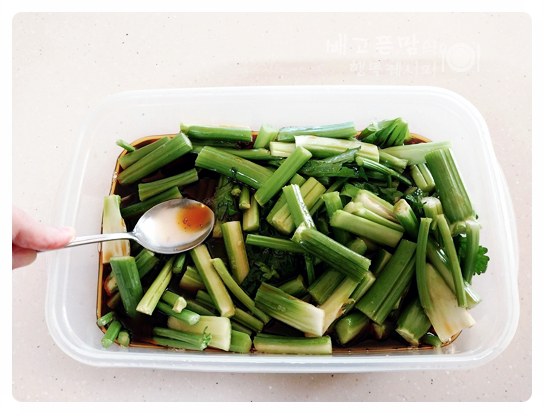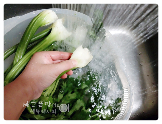 그리고 초록 잎채소 장아찌를 데치지 않고 씻어