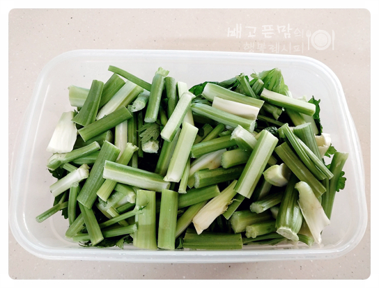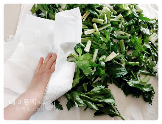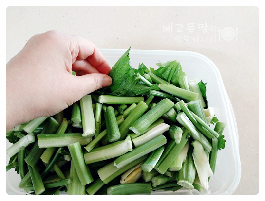 밀폐 용기에 샐러리 잎을 먼저 담고
