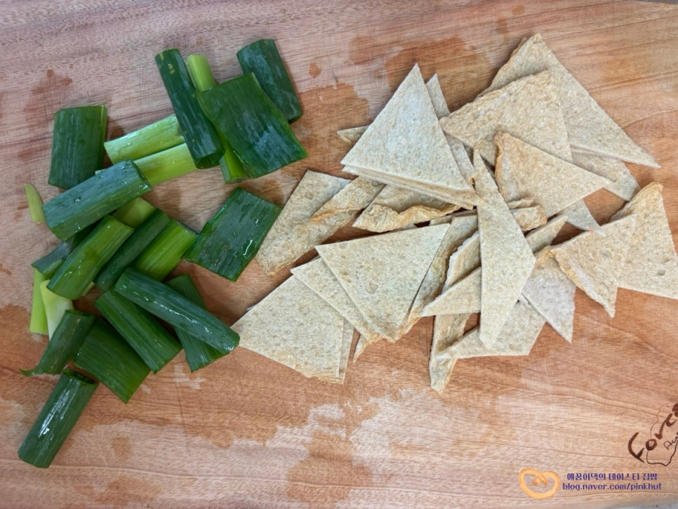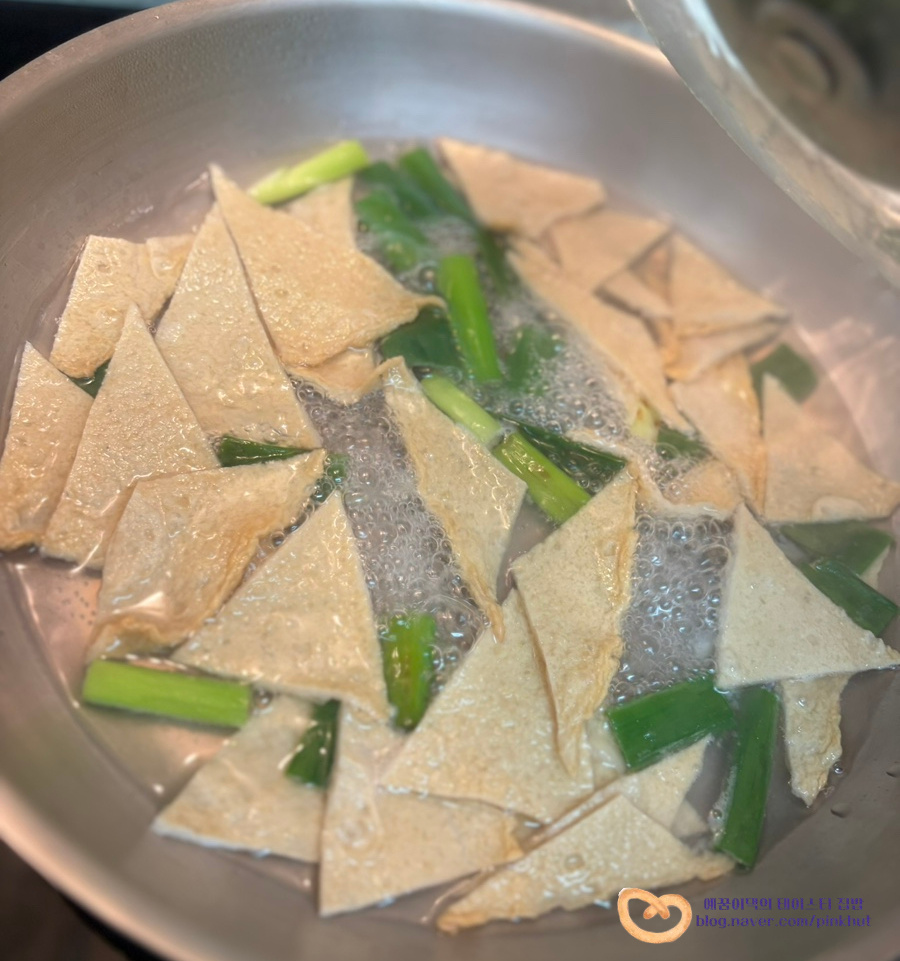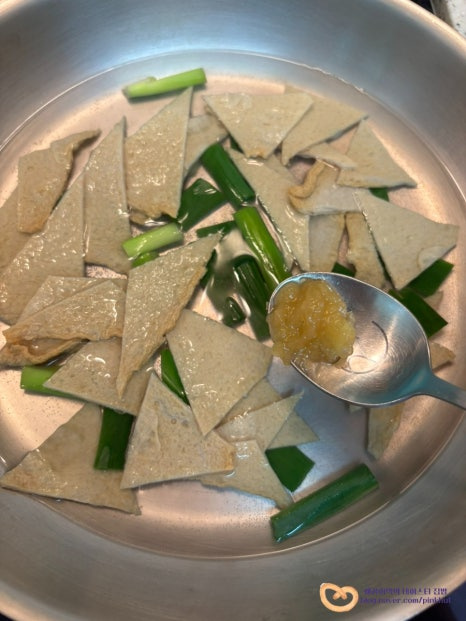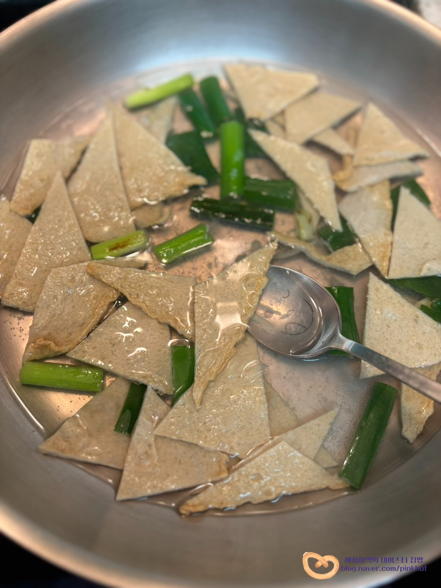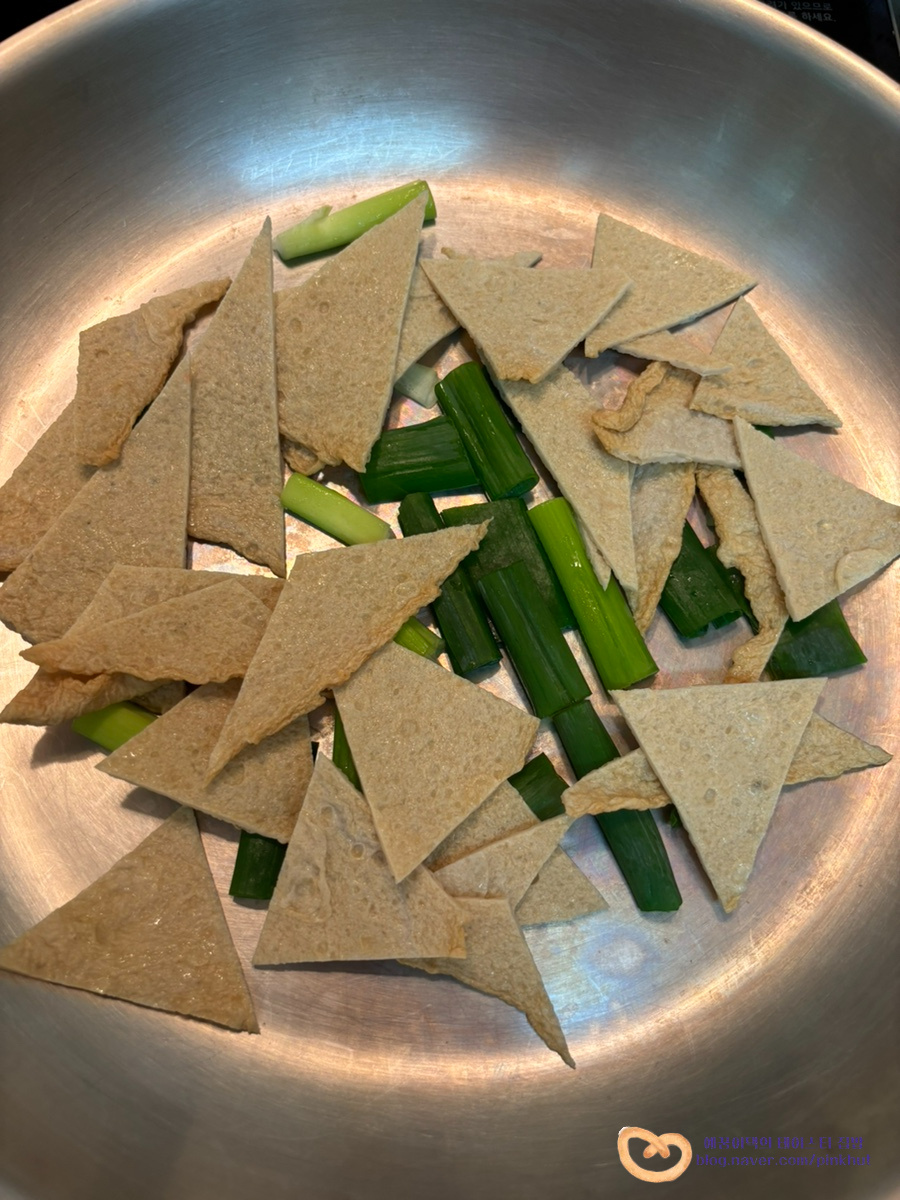 달군 프라이팬에 썰어놓은 대파와 어묵을 깔아주세요