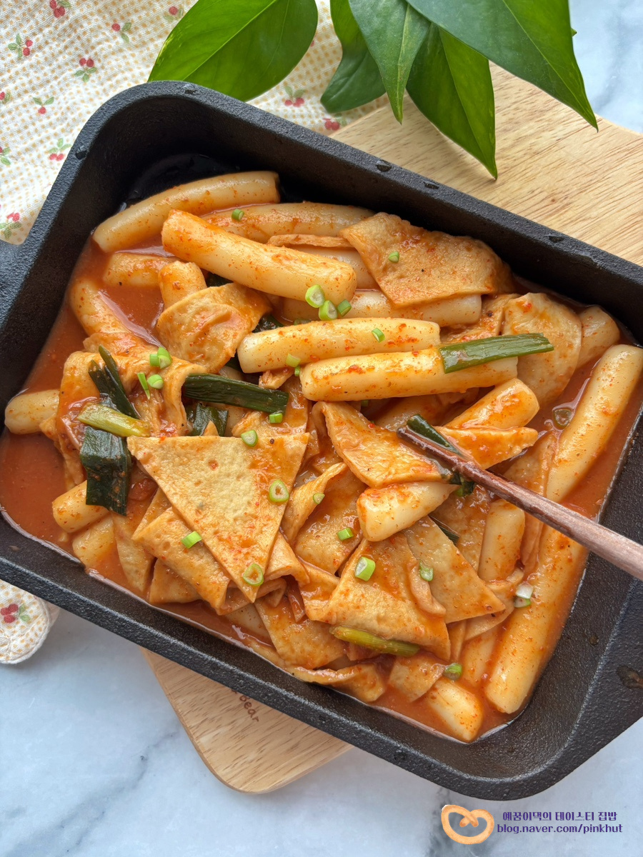 양념은 고추장, 고춧가루, 설탕, 간장, 굴소스 등이 들어가고요 만들기도 쉬워요. 떡.볶.이.의 환상 짝꿍 대파, 어묵만 있으면 되는 간단 국물 떡볶이 레시피입니다