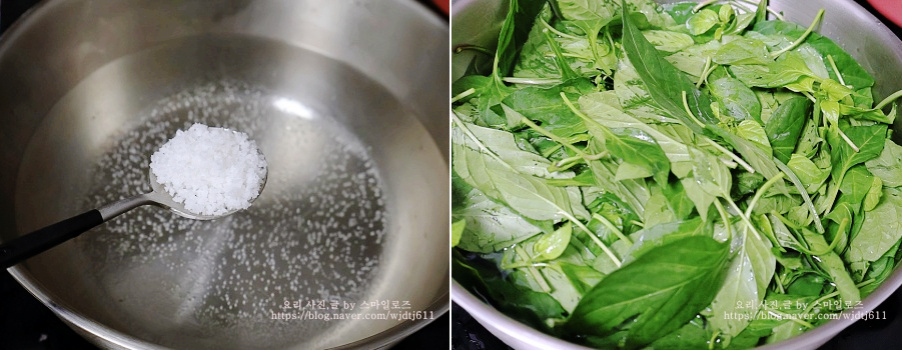 고춧잎 데칠 물이 팔팔 끓으면 천일염 1스푼을 넣고