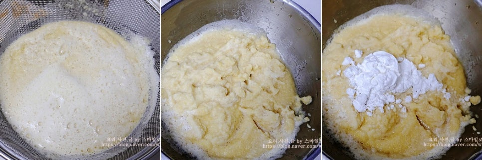 물을 따라 버리고 앙금(전분)만 반죽에 섞어줍니다