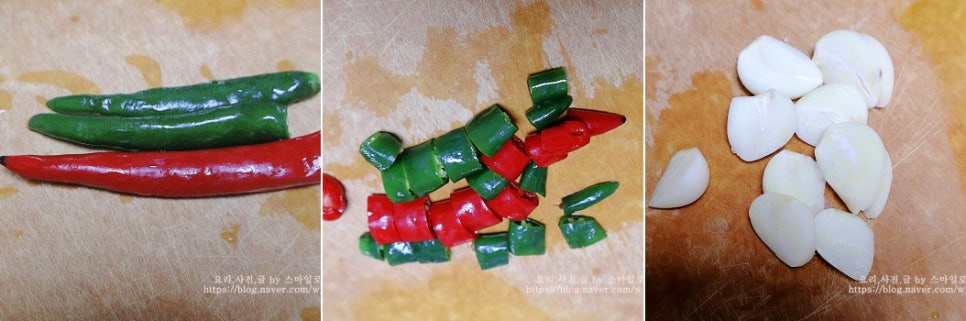 청양고추 홍고추는 송송 썰고 통마늘은 편 썰어 놓았어요