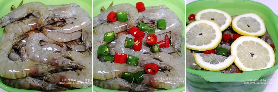 흰 다리 새우 500g 청양고추 2개 홍고추 1개 통마늘 5개 레몬 1개 건고추 3개