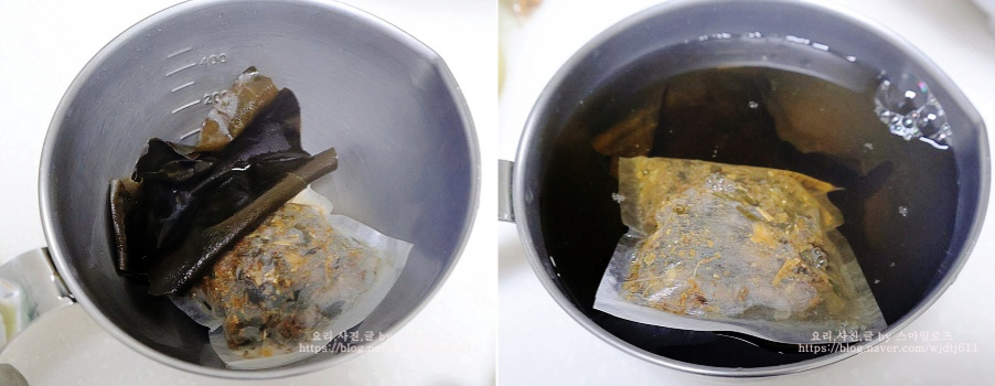 물 2컵에 다시마 1조각과 훈제 멸치 다시 팩을 담가