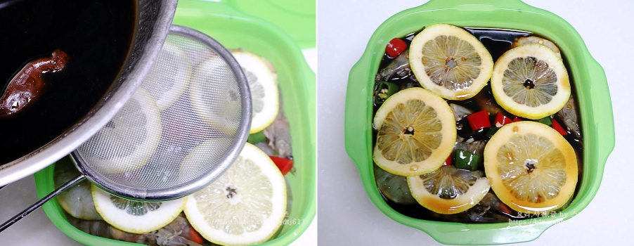 완전히 식은 간장 물을 새우담은 용기에 체를 올리고 부어줍니다
