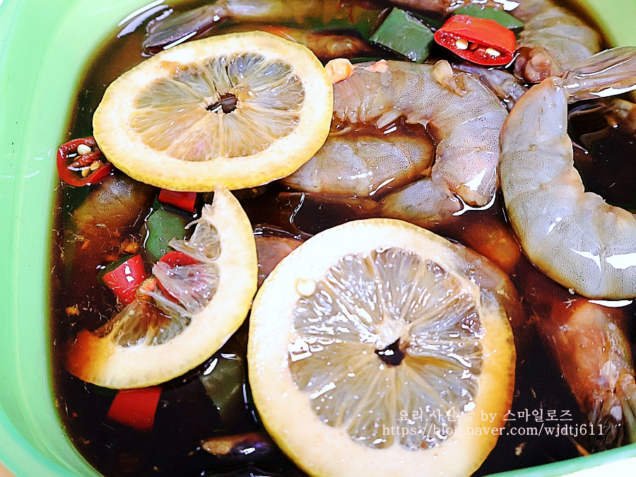 간장 끓여 완전히 식힌 후 새우에 부어주면 비린내 없이 깔끔하고