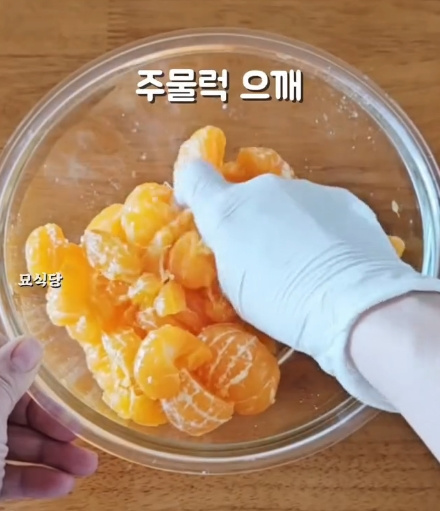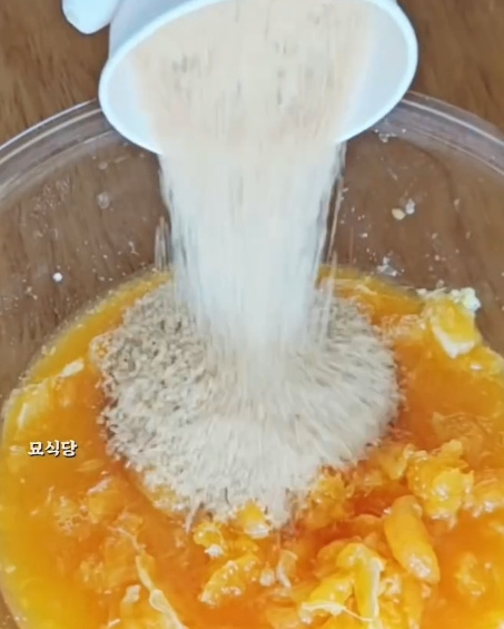 으깬 귤에 원당 200g을 넣고 골고루 섞어주세요. (팁: 설탕을 절반으로 줄여도 귤의 단맛이 에프에서 농축되기 때문에 충분히 달아요.)