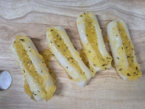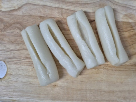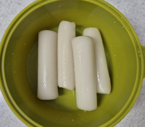 가래떡을 물에 가볍게 씻은 뒤 물을 1~2스푼 정도 뿌리고 전자레인지용 찜기에 담아 1분 30초 정도 돌려 말랑하게 해동한 뒤 마늘소스를 듬뿍 넣을 정도의 깊이로 칼집 또는 가위집을 내 줍니다.