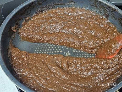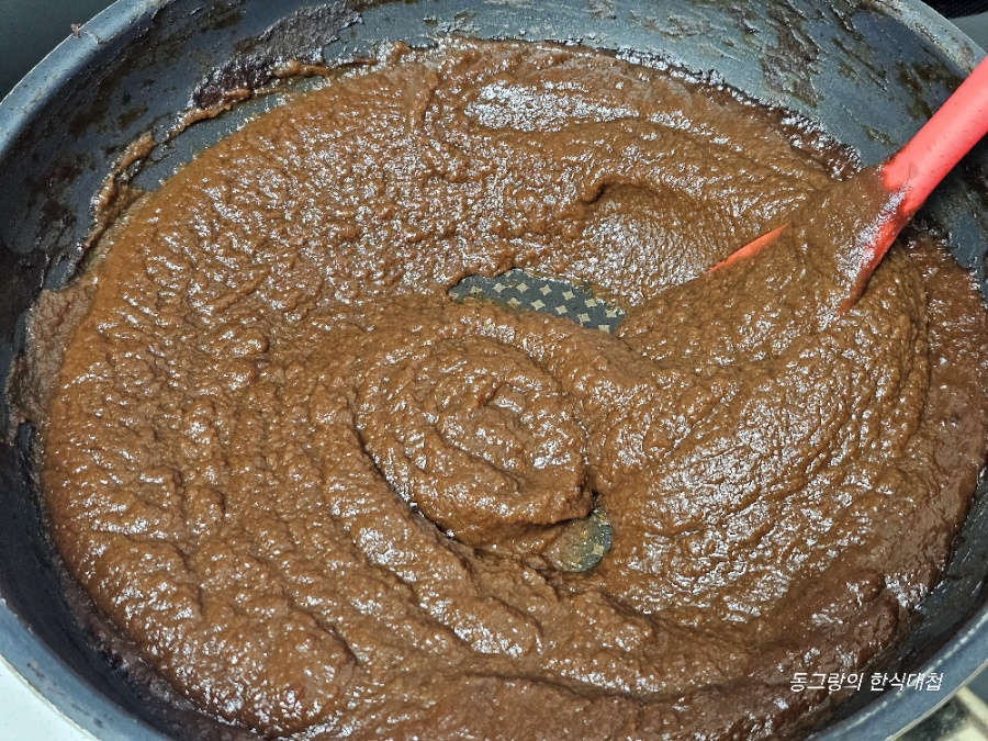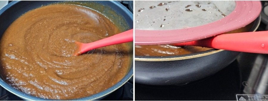 끓으면서 여기저기 튈 수 있으니 뚜껑을 덮고 주걱을 사이에 끼워주고 적당히 줄어들 때까지 조려줍니다.