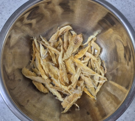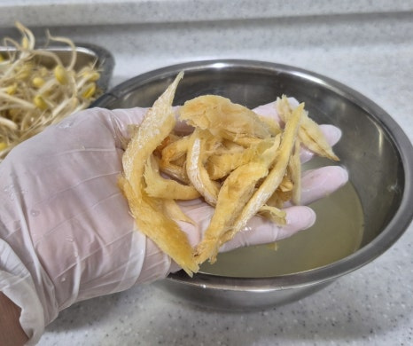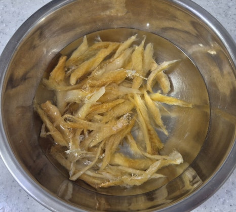 황태채는 4~5cm 정도의 먹기 좋은 길이로 자른 뒤 물 400ml에 5분간 담가 불리고 손으로 물기를 꾹 짜 줍니다.
