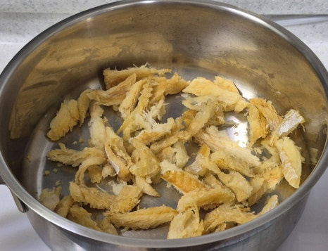 중약불로 달군 냄비에 참기름 1스푼을 두르고 불린 황태채를 넣어 볶다 황태채의 수분이 날아가 꼬들해지면서 구수한 향이 올라오기 시작하면, 불릴 때 사용한 물을 2회로 나누어 넣고 자작하게 끓여 뽀얀 육수를 냅니다.