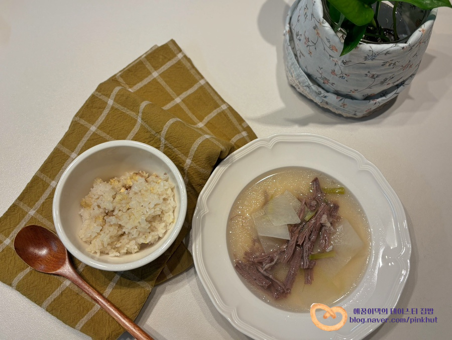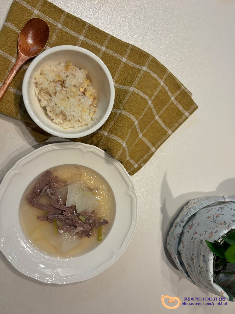 국물 맛을 보면 맑고 개운함이 엄지 척! 완성한 소고기양지 무국에 후루룩 밥 말아서 먹으면 정말 맛있어요.