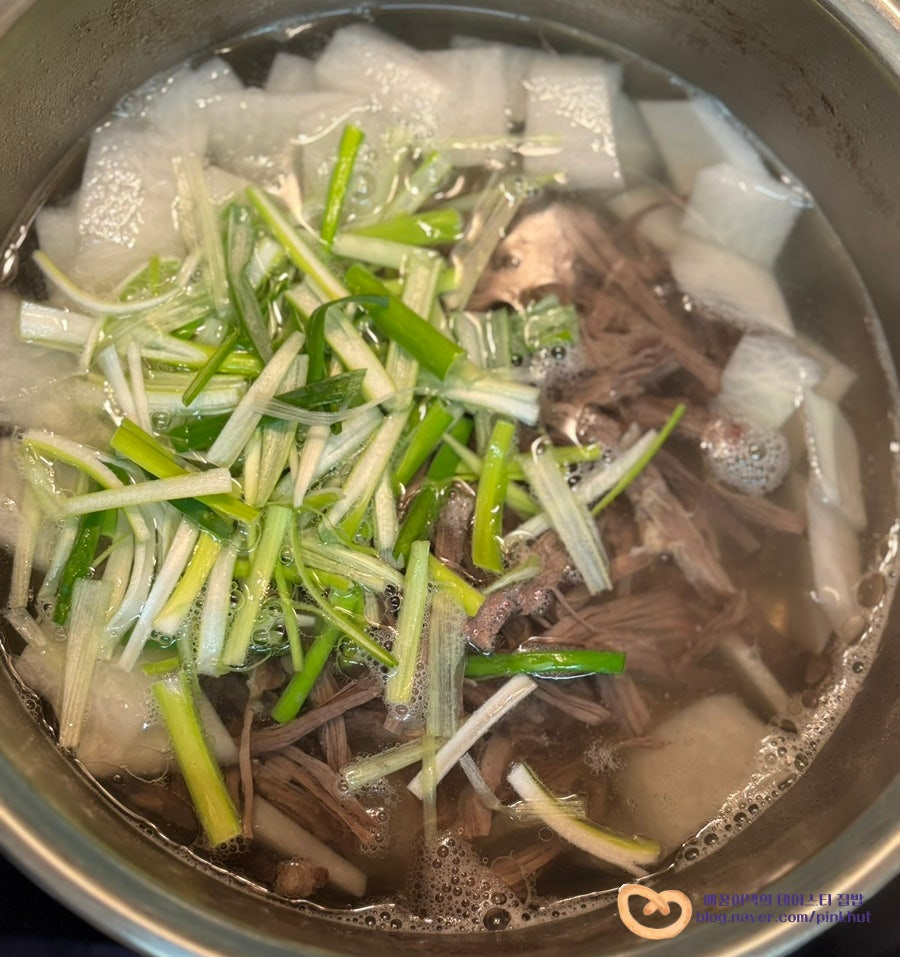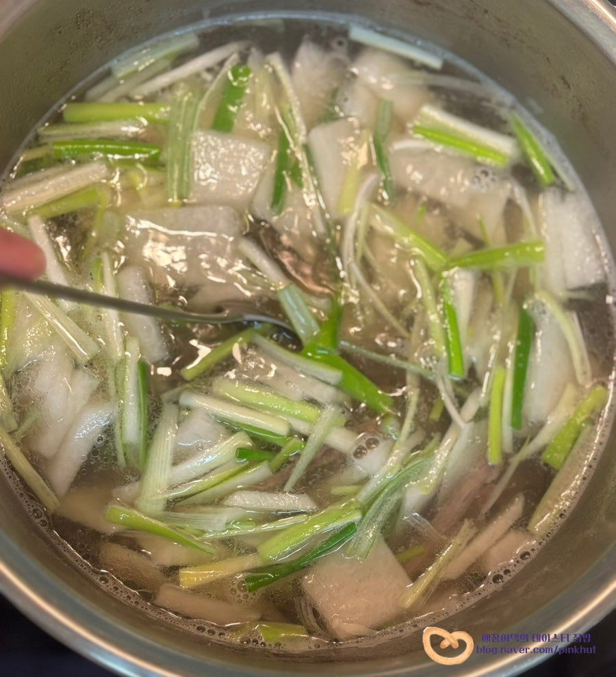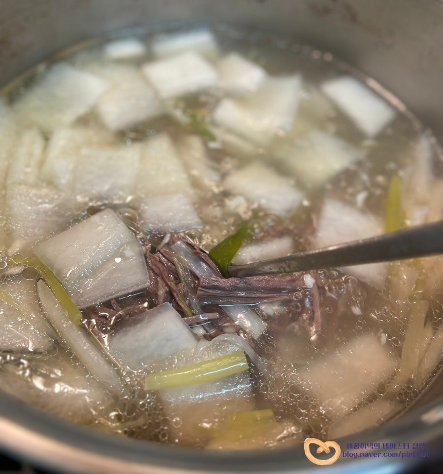 우려낸 육수 2L를 준비해서 보글보글 끓으면 손질해 둔 무를 넣고, 고기, 대파를 넣어주세요.