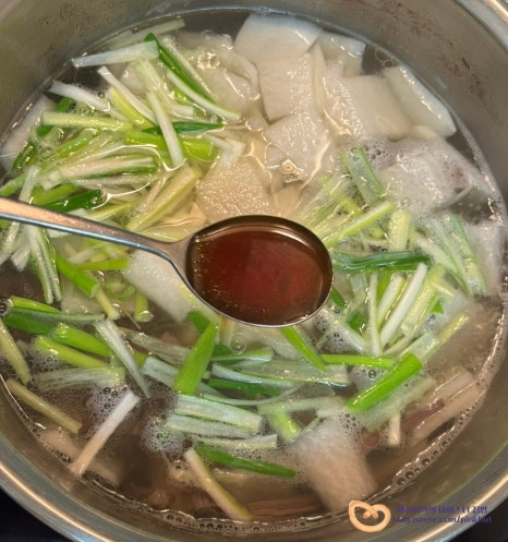 이어서 맑은 소고기무국에 다진마늘 1T, 국간장 3T, 참치액 1T를 넣어 간을 더해 주세요.