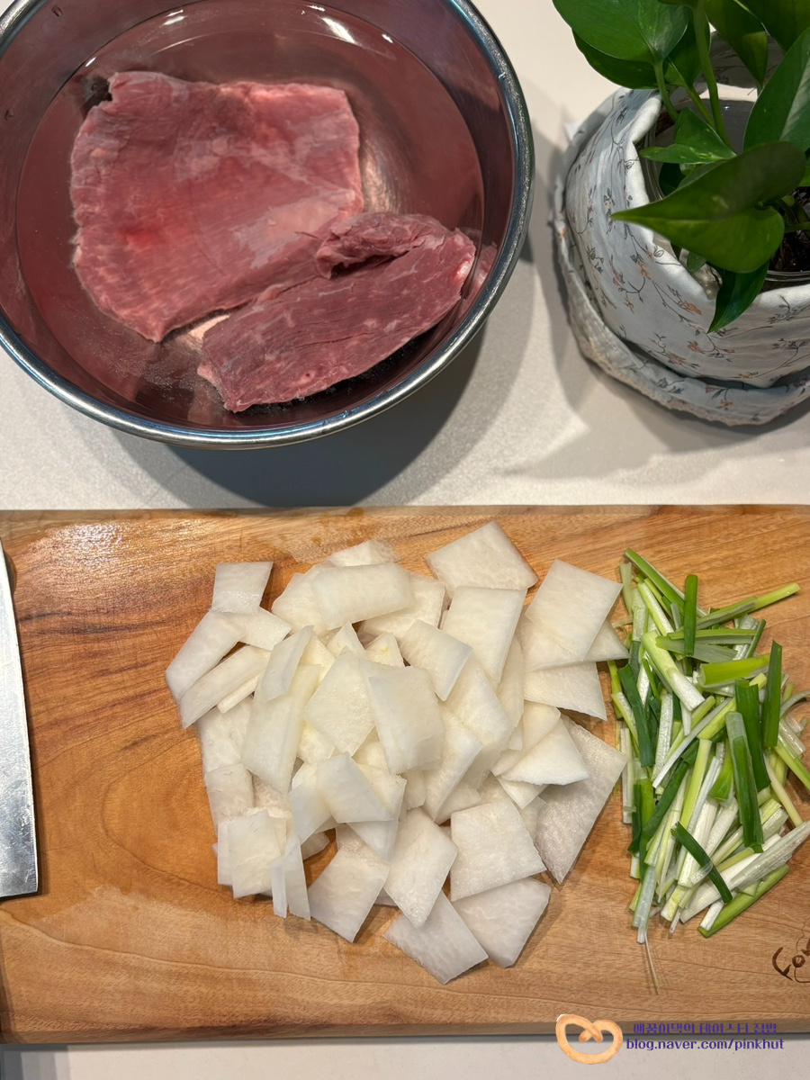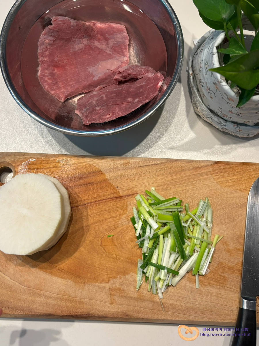 소고기 양지 덩어리 400g , 육수낼 때- 물 2.5L , 무 1토막 400g , 대파 1대