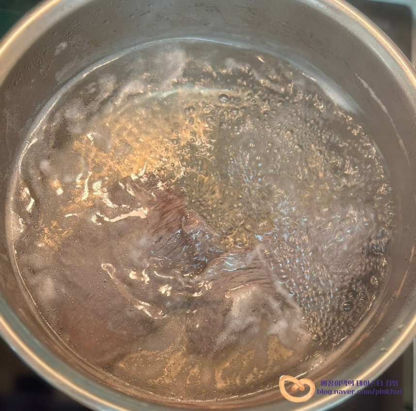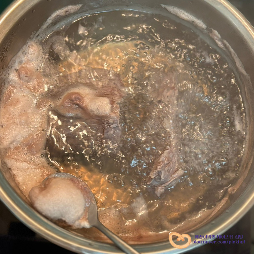 넉넉한 냄비에 물 2.5L를 붓고 핏물 제거한 고기를 넣어주세요. 처음부터 고기를 넣어 보글보글 끓여줄 거예요
