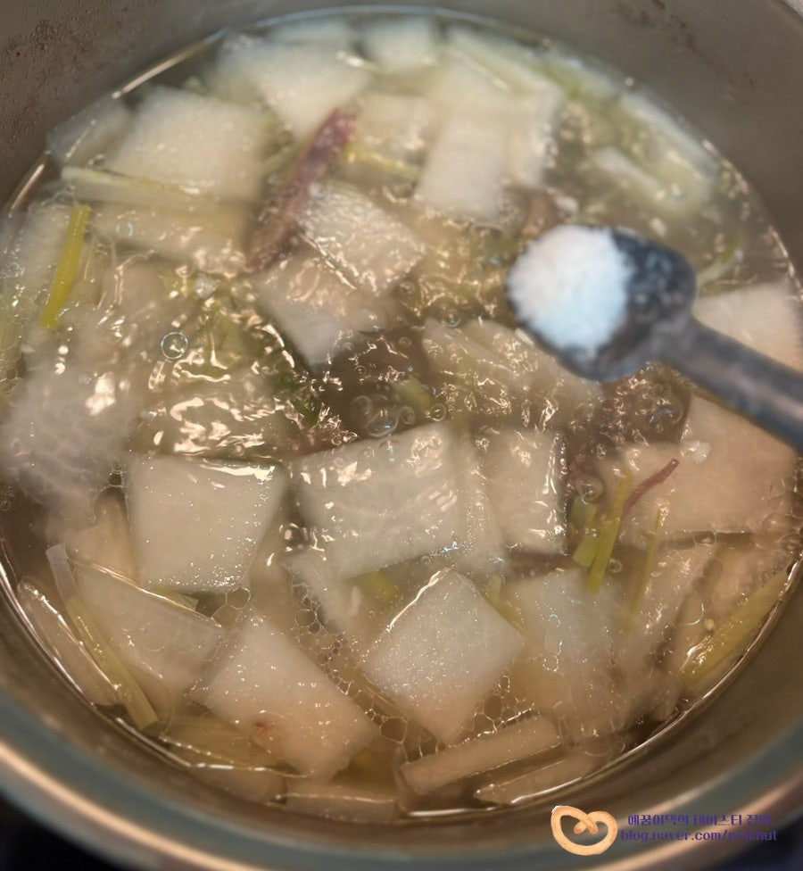 15분 후 무가 다 익었을 때 소금 1/2T 넣어 추가 간을 하고 뒤적여가며 한소끔 보글보글 끓여주세요.