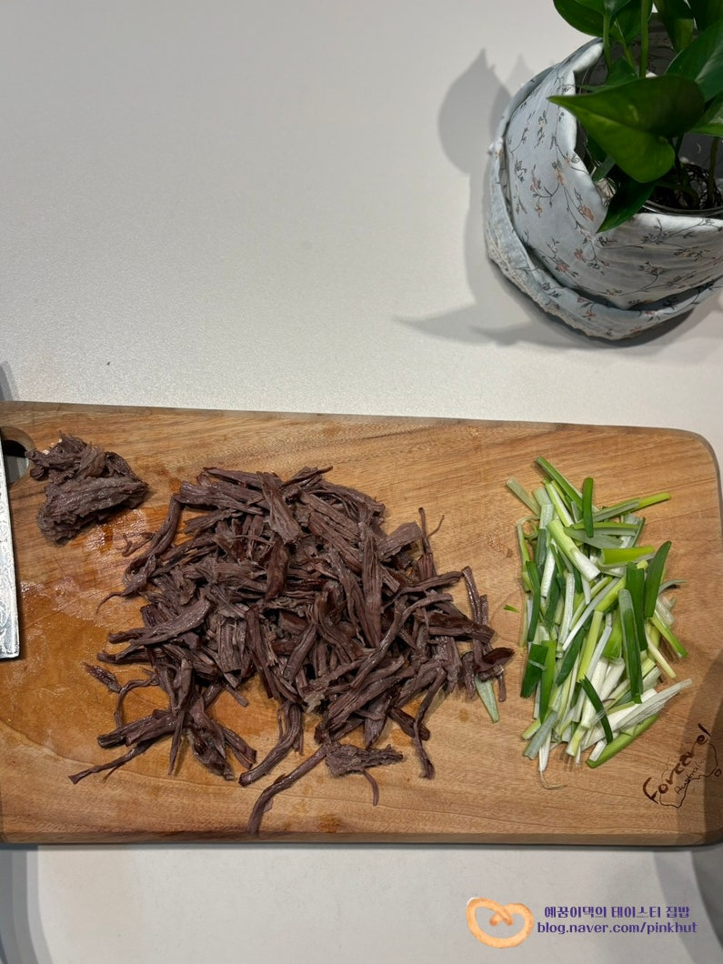 대파 1대는 얇게 채 썰어주었어요. 사진처럼 채 썰면 호로록 먹기 좋고, 식감도 훨씬 좋아요.