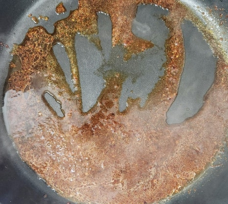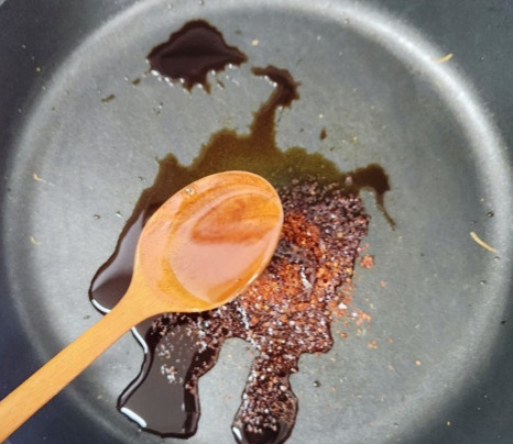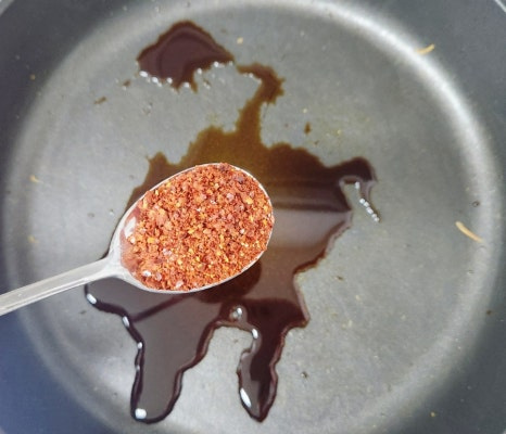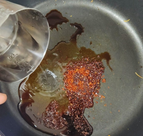 후라이팬에 진간장 3T, 고춧가루 1T, 참기름 1T, 물 50ml를 넣어 한 번 바글바글 끓여 주세요.