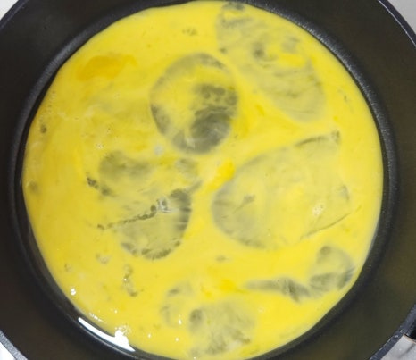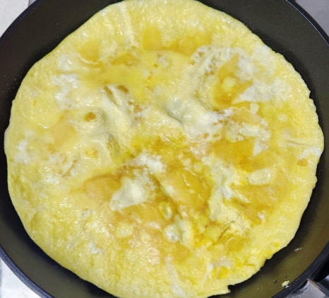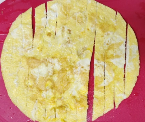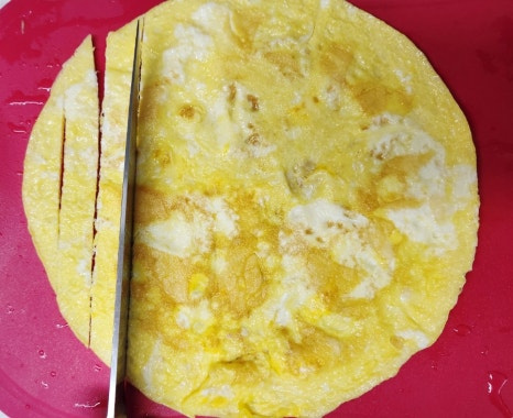 후라이팬에 기름을 두르고 얇게 지단을 부쳐 주세요. 그리고 지단을 꺼내서 길게 썰어 줍니다.
