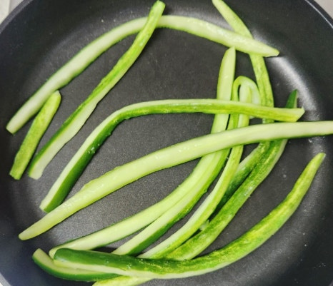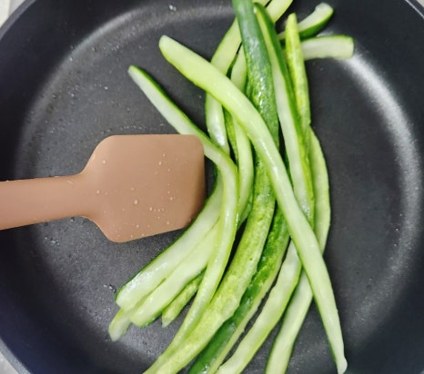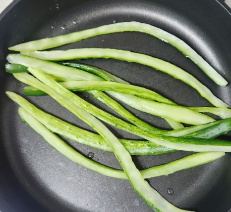 절인 오이는 찬물에 가볍게 헹궈 소금기를 빼고 손으로 살짝 짜서 물기를 제거해 주세요. 이제 후라이팬에 넣고 중불로 볶아 주세요. 오이의 수분이 충분히 빠지도록 볶아야 김밥 속에서 흐물거리지 않아요. 수분이 적당히 사라지면 불을 꺼서 식혀 둡니다.