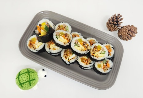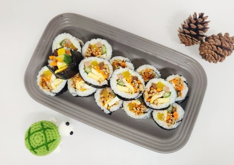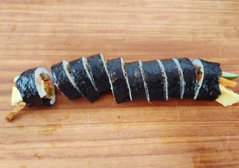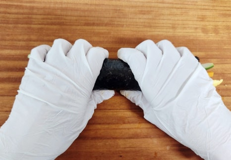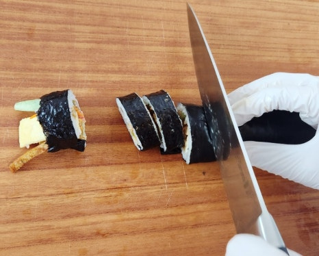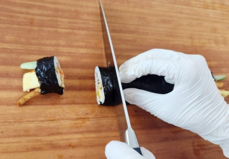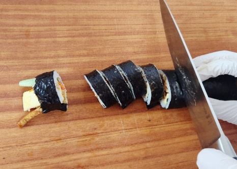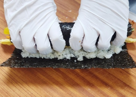 김밥을 말 땐 손가락 끝으로 안쪽으로 말아주면서 단단하게 눌러 줍니다. 이렇게 말면 김말이 없이도 쉽게 말 수 있어요. 김 끝부분이 바닥으로 가게 두면 따로 물을 바르지 않아도 잘 붙어요.