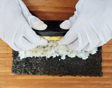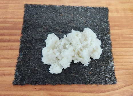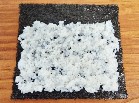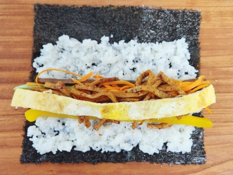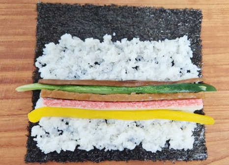 김은 까끌한 면이 위로 오게 도마 위에 올려주세요. 여기에 밥을 김의 약 3/4 정도까지 펼쳐 주세요. 밥을 너무 많이 올리면 말기가 어려워요. 그리고 준비된 재료들을 모두 올려 주세요.