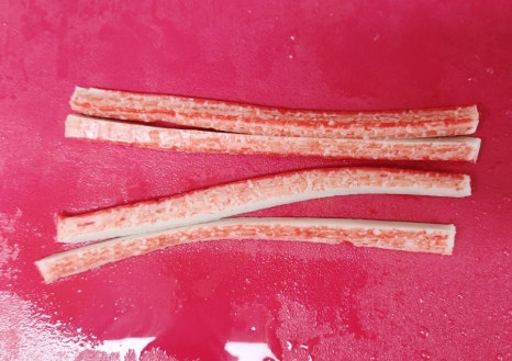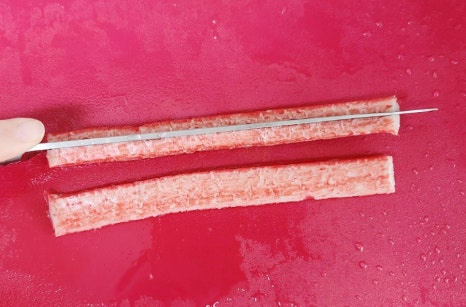 김밥햄 8개를 준비하고 맛살도 반으로 잘라서 8줄로 만들어 주세요.