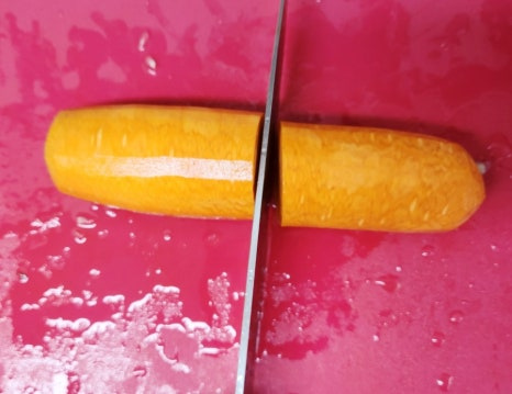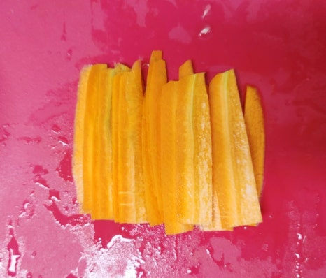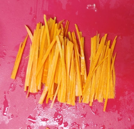 당근 한 개는 껍질을 벗기고 깨끗이 씻은 후 반으로 잘라 얇게 채 썰어 주세요.