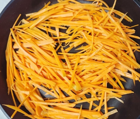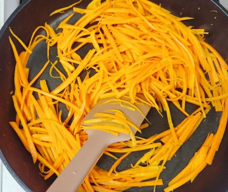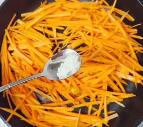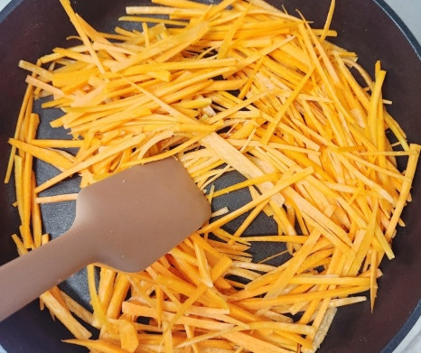 후라이팬에 당근을 넣고 소금 0.5t을 넣은 후 중불에서 볶아주세요. 볶기 시작하면 당근에서 물이 조금 나올 거예요. 수분이 적당히 사라지고 색이 선명해질 때 불을 꺼 주세요. 너무 오래 볶으면 식감이 무르니까 2~3분 정도면 충분해요.