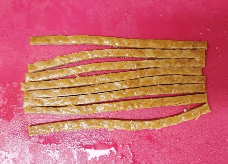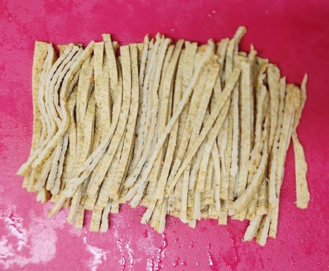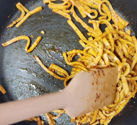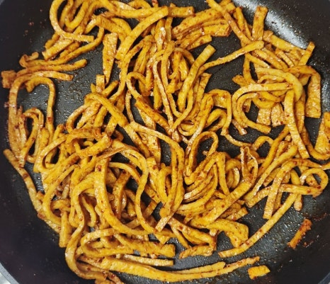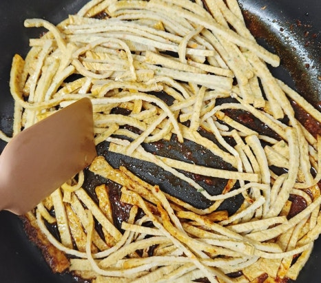 어묵 4장을 얇게 채 썰어서 준비해 주세요.
