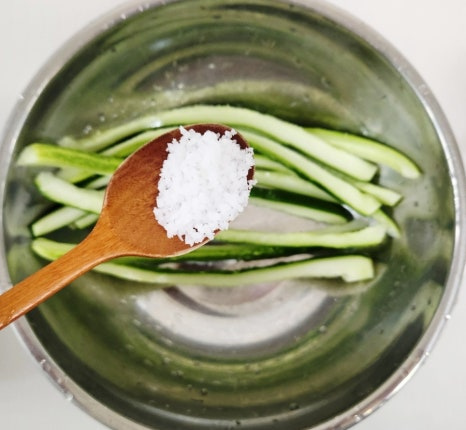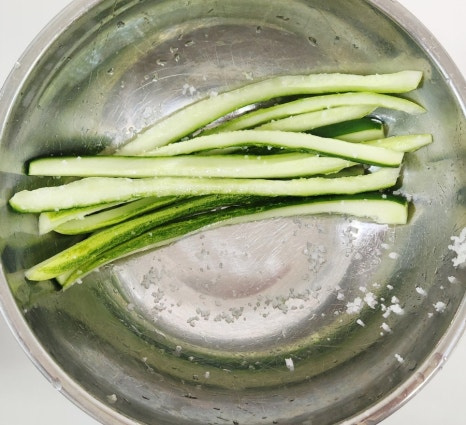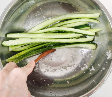 오이 반쪽을 각각 5등분 하여서 잘라 주세요. 이제 오이를 절여줄 건데요. 큰 볼에 자른 오이를 넣고 굵은소금 0.5T를 넣어 주세요. 그리고 잘 섞은 후 30분 정도 절여 주세요.