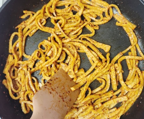 물이 끓기 시작하면 어묵을 넣고 재빨리 잘 섞어 줍니다. 어묵이 양념을 고루 흡수하도록 2~3분 볶아 주세요.