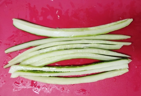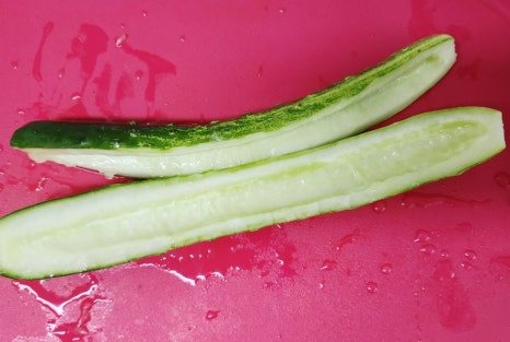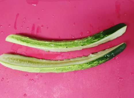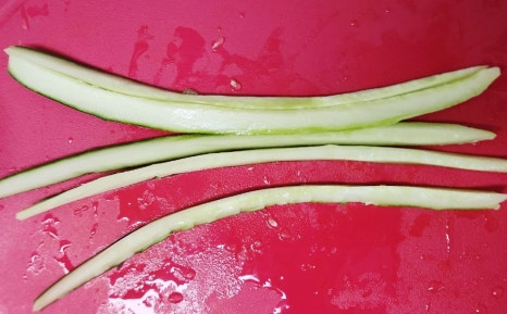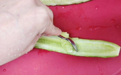 먼저 오이 한 개를 깨끗하게 씻은 후 꼭지를 자르고 반으로 잘라 속씨를 스푼으로 파내 주세요. 이렇게 하면 돌려 깎기를 하지 않아도 오이를 쉽게 자를 수 있어요.