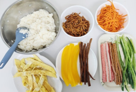 김밥용 단무지와 우엉, 그리고 김밥김까지 준비해서 재료를 모두 세팅해 주세요.