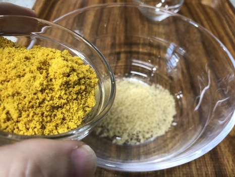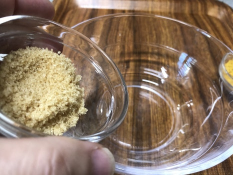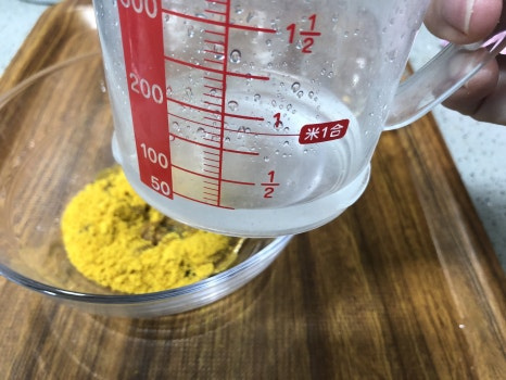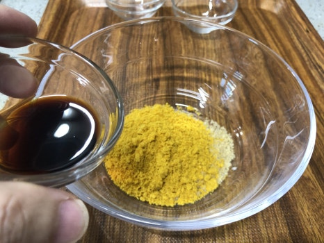 설탕(1스푼)▶카레가루(2스푼)▶간장(1스푼)▶물(50ml)을 빈그릇에 넣고 한번 섞어줍니다.