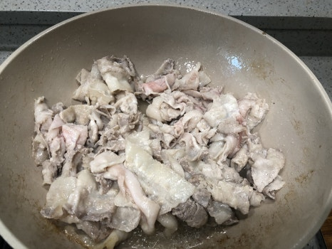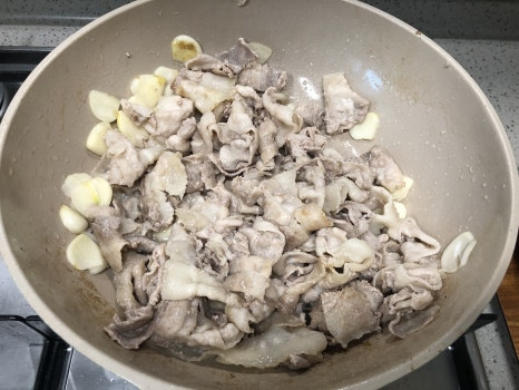 준비된 팬에 대패삼겹살(400g)을 전부 넣고 강불로 익혀줍니다.