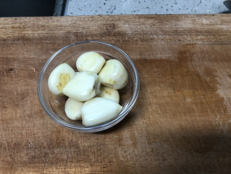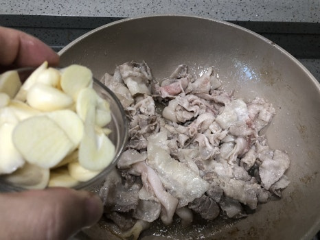 어느정도 핏기가 가시면 손질된편마늘을 전부 넣고 볶아줍니다.