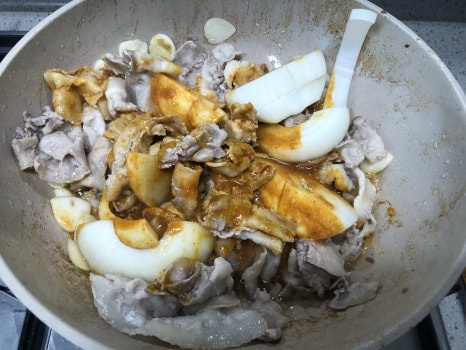 편마늘이 노릇해지면 손질된양파, 양념장을 전부 넣고 볶아줍니다.