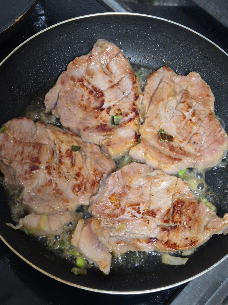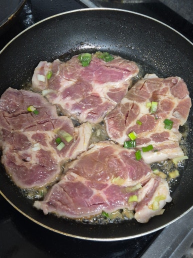 5. 팬에 기름을 넉넉히 두르고 양념을 털어서 고기를 중불로 구워주세요.