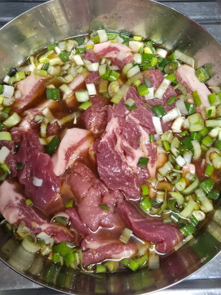 재료목살 1.5kg대파 2대돼지갈비 양념진간장 10T참치액 10T설탕 10T참기름 6T다진마늘 4T식초 2T배음료(238ml) 2캔후추 적당량