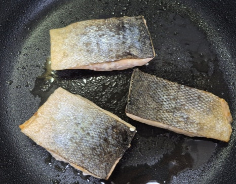 중불로 달군 팬에 올리브오일을 두르고 연어의 껍질 부분이 먼저 닿도록 올려 앞,뒤로 노릇하게 구워 주세요.