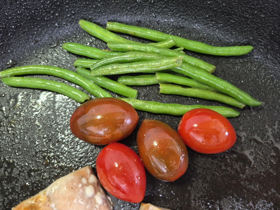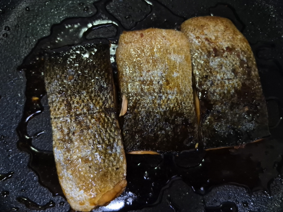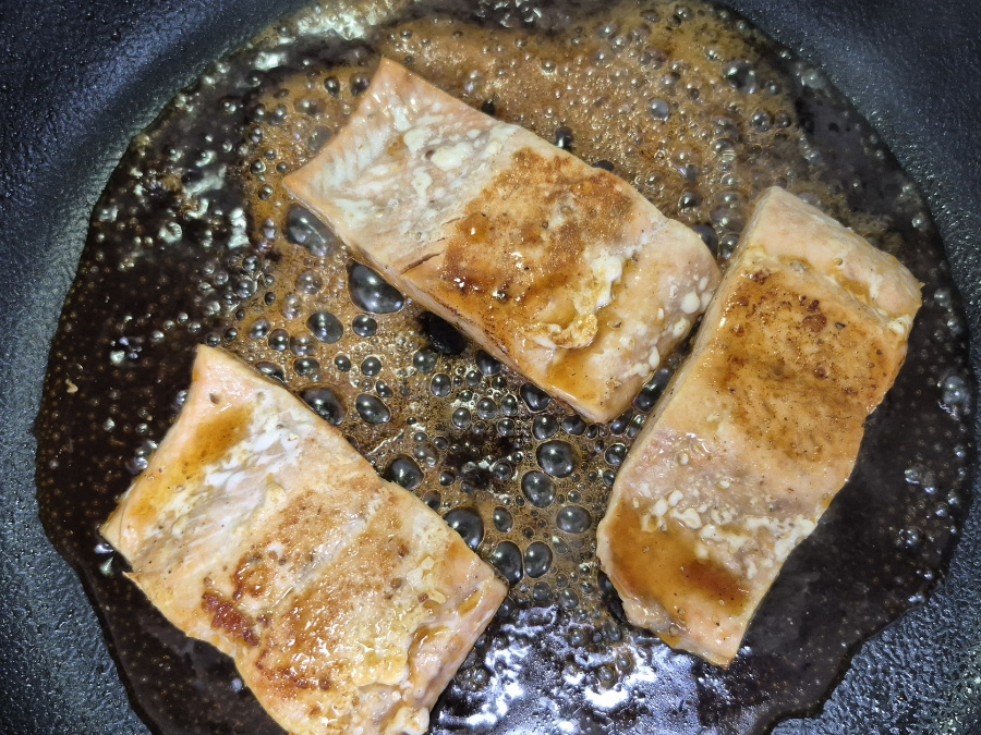키친타월로 팬을 닦아 정리한 뒤,미리 섞어놓은 데리야끼 소스를 붓고 연어를 한번 뒤집어 소스에 조려 완성합니다.