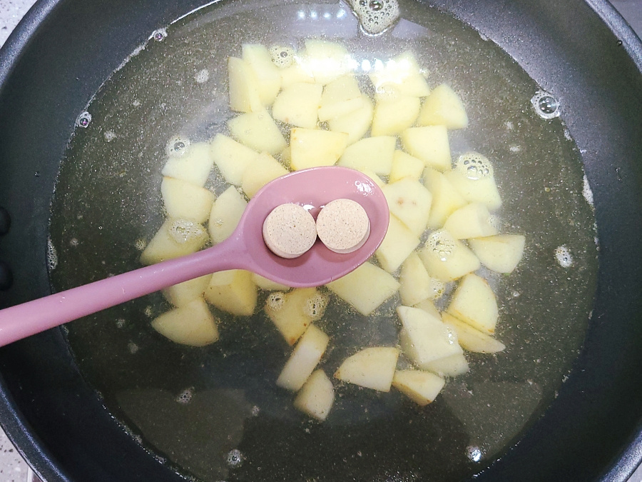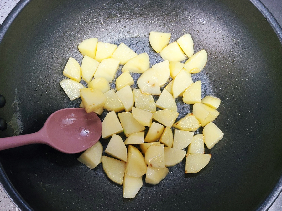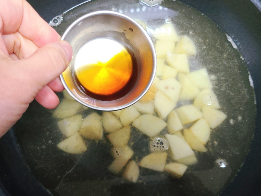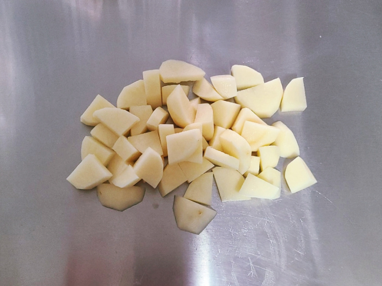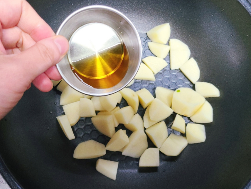 감자중간 정도의 크기 2개를 준비하여 껍질을 벗기고 흐르느 물에 세첫 후, 5mm 정도 두께 한 입 크기로 썰어서 준비합니다.